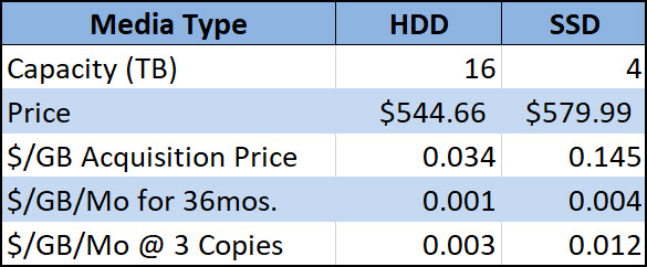 Finally let’s graph the current state-of-the-state for highly redundant object storage. HDD clocks in at $.003/GB/Mo while SSD is at $.012, a factor of 4 difference which makes sense–given that HDD currently enjoys a 4:1 price performance advantage.